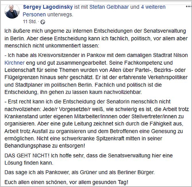 Ernster äußerste sich der ehemalige Pankower Kreisvorsitzende Sergey Lagodinsky auf Facebook