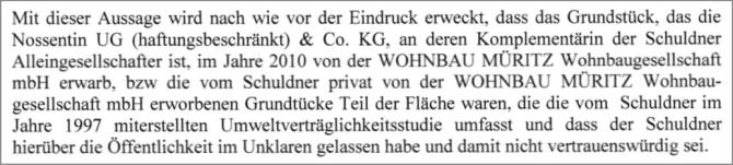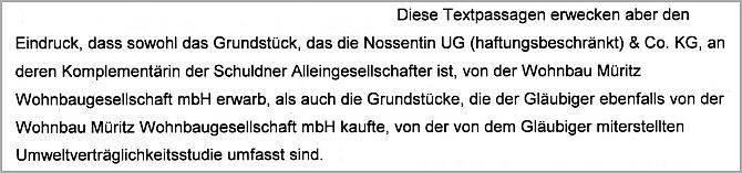 Nein, das Mindrup-Zitat plus Schlussfolgerung erweckt nun wirklich nicht den Eindruck, dass sowohl das Grundstück der Nossentin UG (haftungsbeschränkt) Co. KG, an deren Komplemetärin ich Alleingesellschafter sein soll, von der Wohnbau Müritz Wohnbaugesellschaft mbH erwarb… .