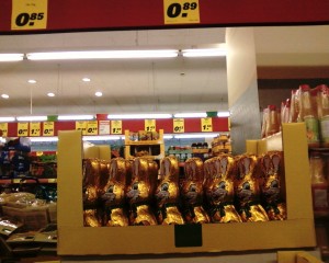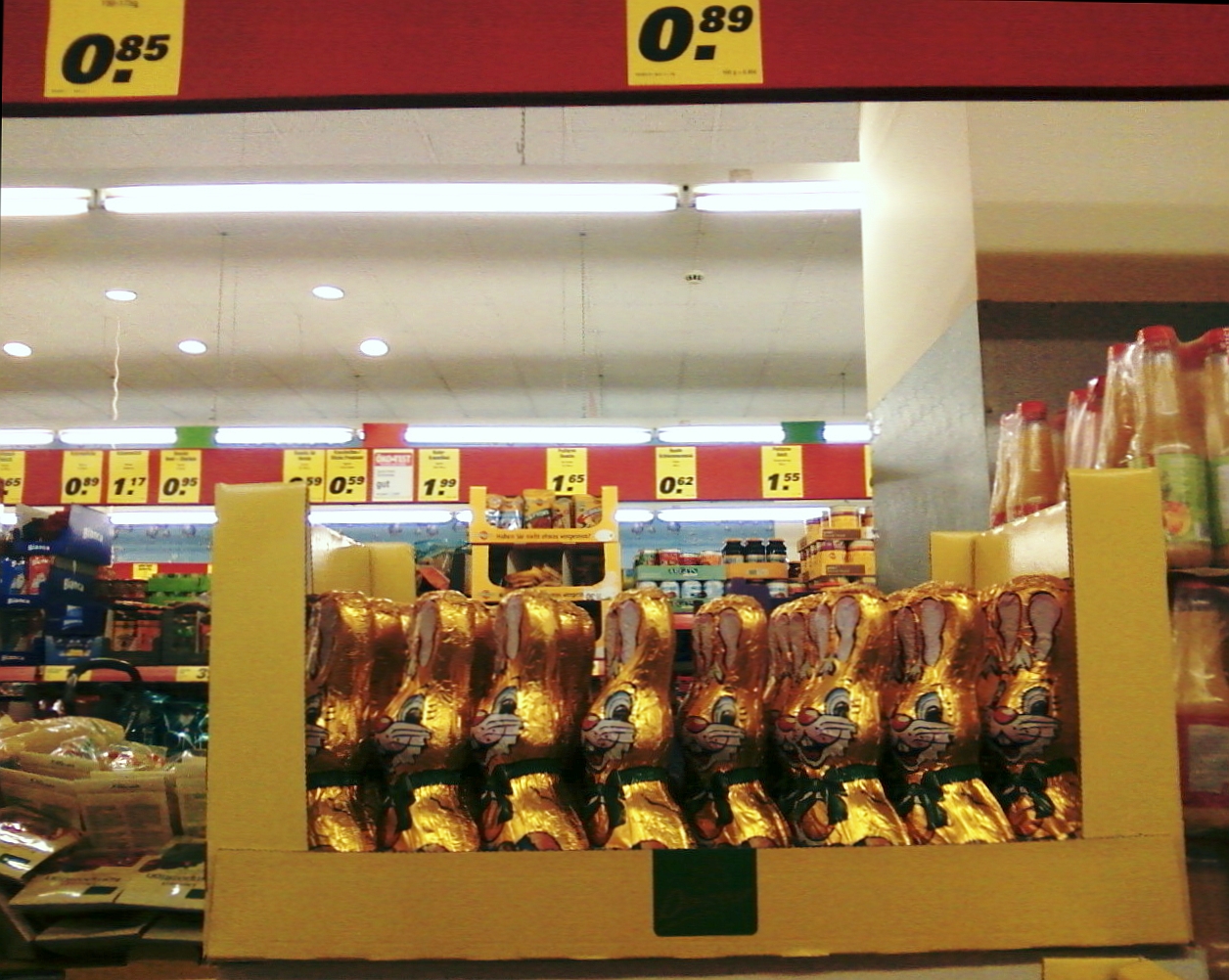 Nur wenige Tage nachdem die letzten ausgehöhlten und mittlerweile leicht patinierten Schokoladenruprechte zum halben Selbstkostenpreis an die werte Kundschaft verschleudert wurden, lachen einem nun die goldglänzenden Hoppelhäschen aus den Regalen an.