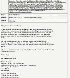 Die „Bürgerwerkstatt“ ist zudem eine mit öffentlichen Geldern finanzierte Einrichtung, die sich mit Angelegenheiten von erheblichen öffentlichen Interesse befasst. Mehr noch: Wie den auch Ihnen bekannten Äußerungen des Vorsitzenden der BVV-Fraktion von Bündnis 90/Die Grünen des Bezirkes Mitte, Herrn Bertermann, zu entnehmen war, hängen von den Ergebnissen der Arbeit der „Bürgerwerkstatt“ weit reichende politische Entscheidungen ab. Somit sind auch die Angehörigen der Bürgerwerkstatt – soweit sie im Zusammenhang mit der Arbeit der „Bürgerwerkstatt“ abgebildet werden – Personen des öffentlichen Interesses, für die nur ein sehr eingeschränktes und hier nicht greifendes „Persönlichkeitsrecht“ geltend gemacht werden kann.