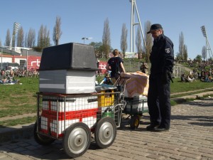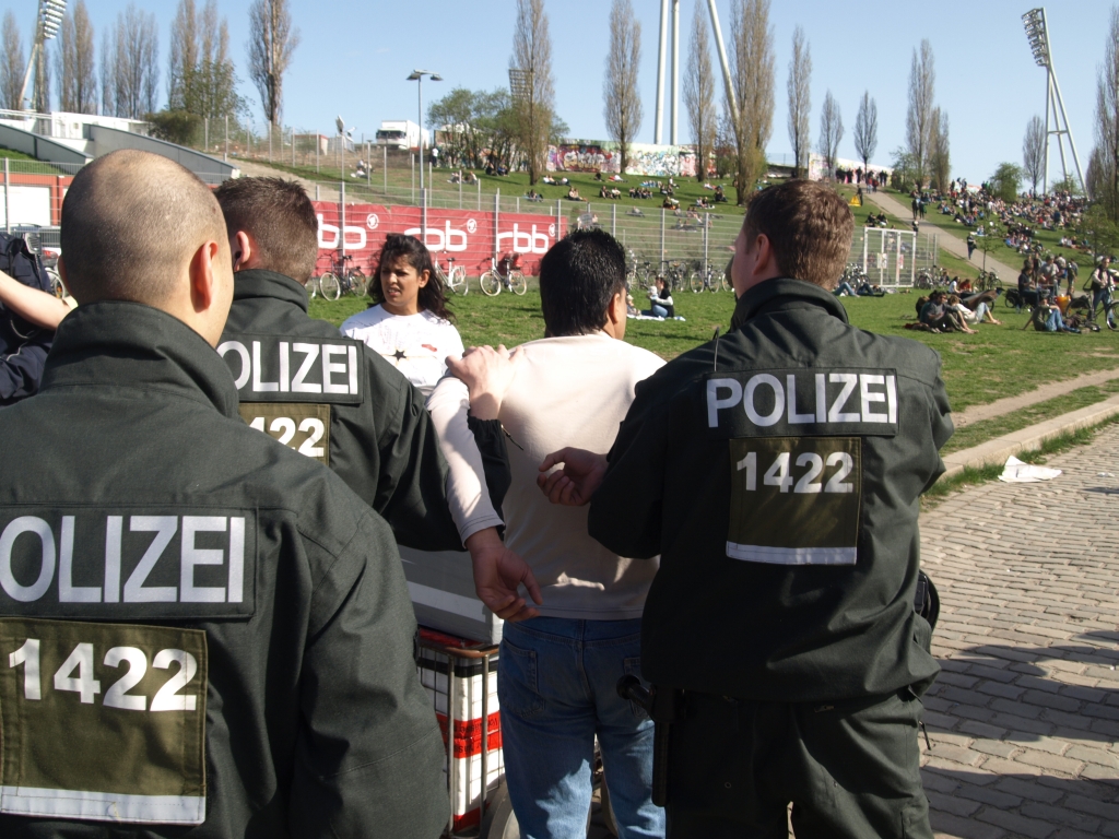 Unten im Park, auf Höhe der Max-Schmeling-Halle, wird dann offenbar, dass jene Beamte offenbar an einem Einsatz gegen sogenannte fliegenden Händler beteiligt sind, die hier seit Jahr und Tag Getränke an die Besucher des Mauerparks verkaufen.