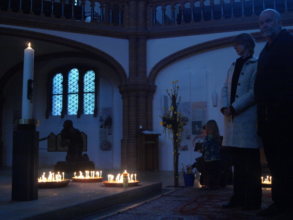 Als sich die Augen an die Dunkelheit gewöhnt haben, ist das Erstaunen groß: Die Kirchenbänke sind zu gut zwei Dritteln besetzt, ziemlich weit hinten findet der Neuankömmling noch Platz. Kaum hat er sich gesetzt, ist auch der Chor wieder zu hören, der hinten am Eingang Aufstellung genommen hat. Dann, einer Prozession gleich, wird eine Kerze nach vorn getragen. Dann werden Texte vorgetragen. Sie handeln von von den Grauen dieser Welt, den vergangenen und den gegenwärtigen. Die Vortragenden stehen im Dunkeln, und wenn das Auge nicht sehen kann, dann schärfen sich die verbliebenen Sinne. So entsteht ein inneres Bild: Das Gesprochene zeichnet die Konturen, die Farben sind die Töne des Gesangs. Zwischen jeder der Rezitationen tritt Stille ein, dann gibt ein schwerer, durchdringender Gong den Auftakt für ein nächstes Bild.