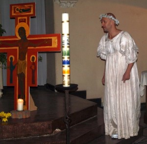 Nach der Predigt werden die mitgebrachten Kerzen entzündet – die ersten am Osterlicht dann wird das Feuer in der Gemeinde weitergereicht. Es wird gebetet und danach entbietet jeder seinem Nachbarn den Ostergruß: „Der Herr ist auferstanden“. „Er ist wahrhaftig auferstanden.“