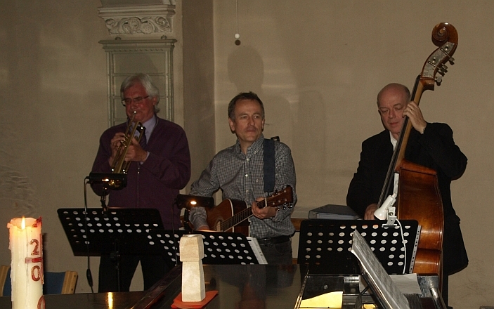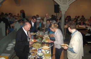 Sprachs und begibt sich zu seinem Kontrabass sowie zu seinen Glaubensbrüdern Felix Dürr und Urs Trösch, die bereits mit Gitarre und Trompete auf ihn warten. Sie spielen ganz unösterlichen Swing. Danach bittet Schubert die Anwesenden, die Kirchenbänke zu verlassen und sich an die aufgebauten Tische zu begeben. Der Jugend-Gospelchor „Stimmt so“ der Gemeinde Prenzlauer Berg Nord bringt erneute Stimmung in die heilige Halle, dann wird das Buffet eröffnet. Essen, Trinken, Gespräche mit Tischnachbarn, die man möglicherweise noch nie zuvor gesehen hat.