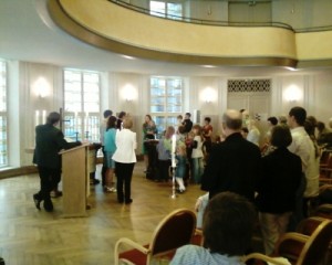 Nun bittet die Pfarrer Zeiske die Anwesenden sich vorn zu versammeln, dort, wo der Taufstein steht. Fünf erwachsene Männer und Frauen sollen getauft werden. Heiter geht dieses Ritual vonstatten, die Gemeinde hat fünf neue Glieder.