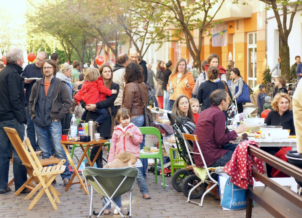 Wenn irgendwo in Prenzlauer Berg der alte Slogan „Heraus zum 1. Mai!“ tatsächlich wortwörtlich genommen wurde, dann in der im Bötzowviertel gelegenen Käthe-Niederkirchner-Straße. Nicht nur die Anwohner selbst gingen auf die Straße – Teile ihres Hausrates nahmen sie gleich mit: Tische, Stühle und Geschirr. Daraus bauten sie die wohl längste Tafel, die die Stadt an jenem Tag aufzuweisen hatte. Die Anwohner feierten ihr zweites Kirschblütenfest. Jeder brachte Speis und Trank mit auf die Straße, es gab ein Kinderprogramm und einen Flohmarkt für die Kleinen, Musik, Tanz…