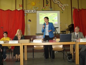Nachdem die Gesamtschulsprecher Le Linh und Greta den Anwesenden ihre Schule vorgestellt und Chorkinder ein paar Lieder gesungen hatten (manche Dinge ändern sich nie!), erklärte die Senatorin den Grund ihrer Aktion: Mit Beginn der Freiluftsaison hat auch die Vermüllung der öffentlichen Grünflächen und Parkanlagen begonnen – und das geht ins Geld.