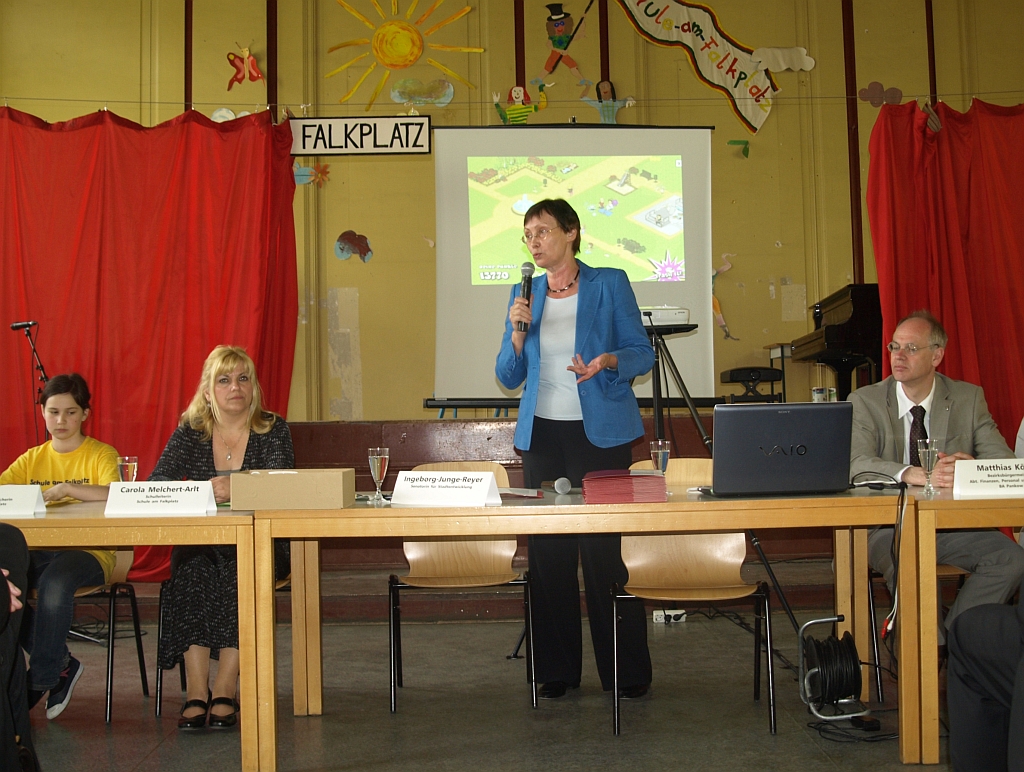 Ein Computerspiel, musizierende Papierkörbe und Kinder, die Erwachsene darauf aufmerksam machen, dass sie ihren Müll bitteschön in die vorhandenen Abfallbehälter werfen – das ungefähr war die Botschaft Stadtentwicklungssenatorin Ingeborg Junge-Reyer am Mittwoch unter die Menschen bringen wollte. Dazu hatte sie in die Schule am Falkplatz geladen.