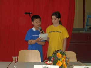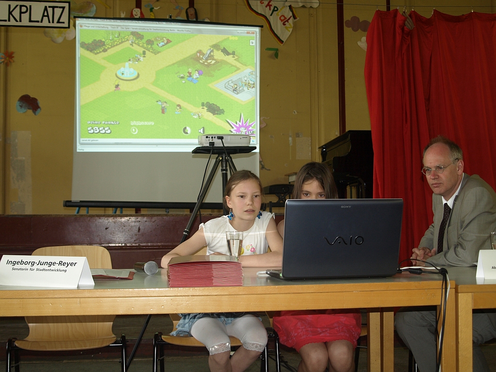 Obwohl die Erwachsenen als Hauptsünder geoutet wurden, richtet dich die Aktion nicht zuletzt an die ganz jungen. So wurde zum Beispiel ein Online-Spiel mit dem Titel „Trash it!“ kreiert: Wer dort den meisten Müll in die Tonne befördert hat die höchste Punktzahl und somit gewonnen. In den Aktionswochen, die bis zum bis zum 11. Juli laufen, sollen „Trash it!“-Wettbewerbe von Jugendlichen organisiert werden. Und damit jeder auch gleich mal erleben kann, wie das Spiel funktioniert, machten sich zwei Falkplatz-Schülerinnen daran, es – via Beamer – den Anwesenden vorzuführen. Allein – eine übergroße Punktzahl wurde nicht erreicht – was die Schulleiteren entschuldigenbd mit den fehlenden Mousepads erklärte.