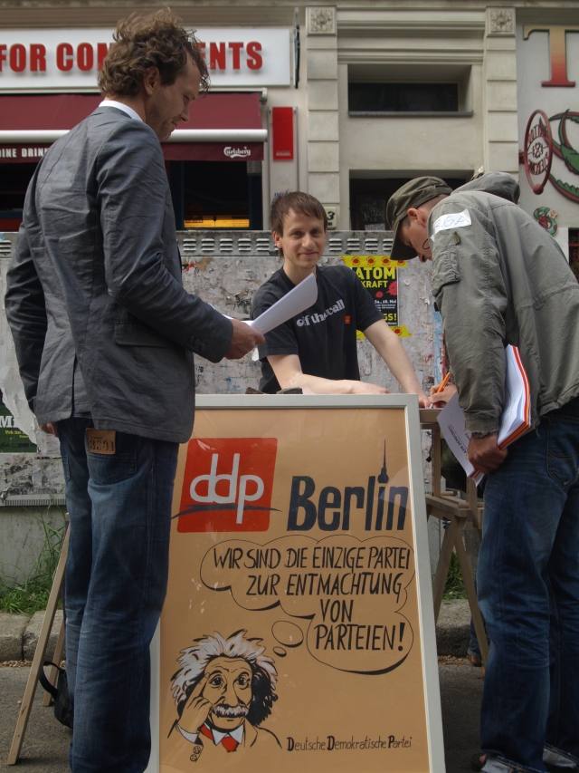 Handgeschriebene Namenszüge wurden auch von anderen erbeten – von der Piratenpartei zum Beispiel für ihre Zulassung bei den Abgeordnetenhauswahlen. Gleiches tat die „ddp“, die konsequent für die Entmachtung aller Parteien eintritt – und natürlich eine Partei ist… .