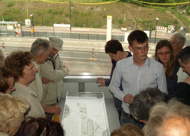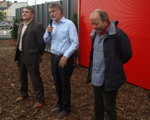 Danach äußerte der Redner gegenüber dem ebenfalls vorn stehenden Stadtentwicklungsstadtrat Michail Nelken (rechts im Bild) die Hoffnung, den Stand der Dinge korrekt wiederzugeben, um dann zu verkünden, dass noch nichts endgültig feststehe und samstags seine Mitarbeiter bei Kaffee und Kuchen Anregungen der Bürger entgegen nehmen werden.