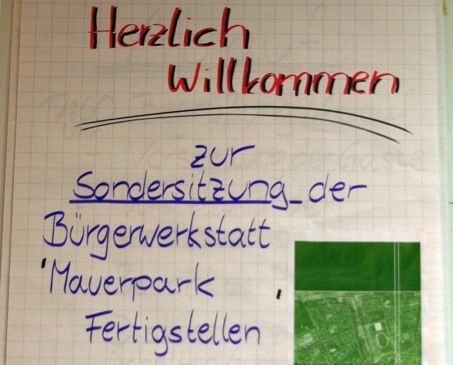 Bei dem Interesse, das der Mauerpark von jeher auf sich zog, und dem Engagement von Anwohnern und Bürgerinitiativen, war es abzusehen, das die Zahl der Eingaben gegen dass Teilbebauungsvorhaben erheblich sein wird. Es bestand also die reale Gefahr, dass das Vorhaben des Grundstückstauschs vor dem politischen Aus gestanden hätte, bevor es überhaupt in Gang gekommen wäre. Hier nun kam man – offenbar in der Verwaltung von Ephraim Gothe – auf die fast genial zu nennende Idee der „Bürgerwerkstatt“.