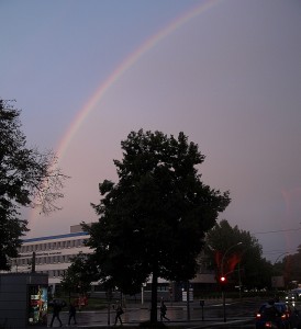 Und in der anderen Richtung – über die Prenzlauer Allee hinweg, direkt über der Grellstraße: Ein kräftiger, vollständiger Regenbogen. Wunderschön und Wunder verheißend – und wer unter ihm hindurch lief oder fuhr, kam… auch diesmal nur wieder in einer unverändert gebliebenen Greifswalder Straße an.