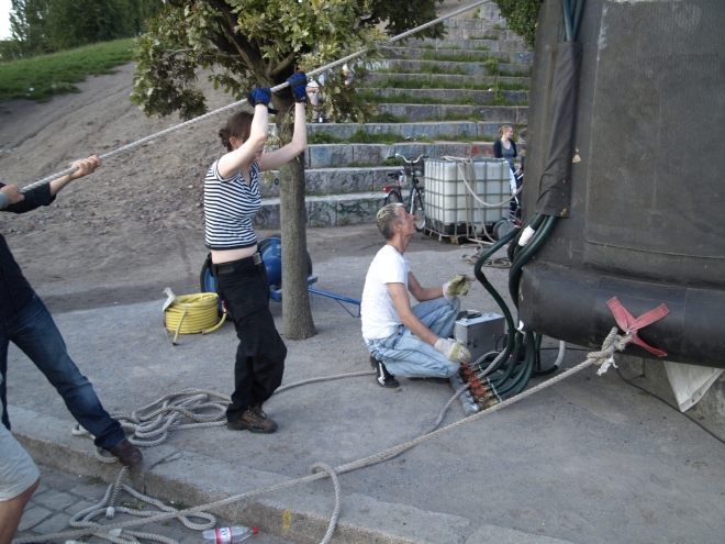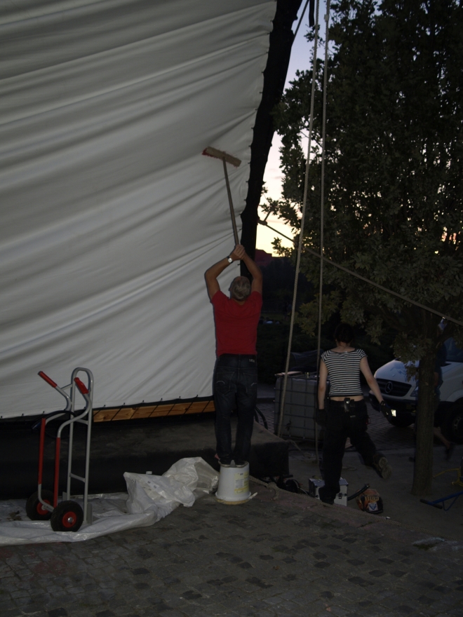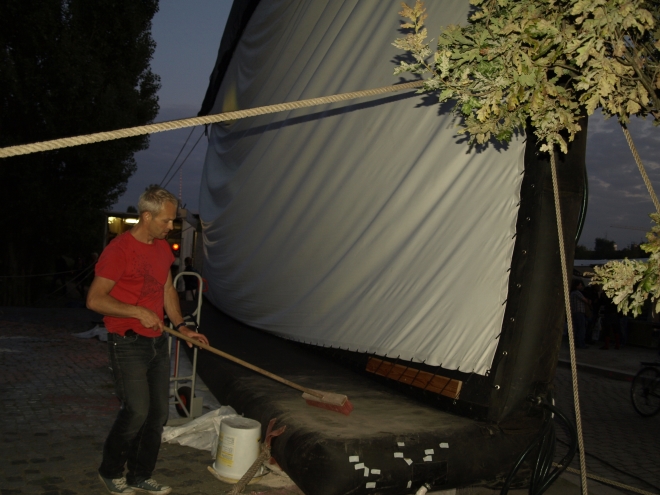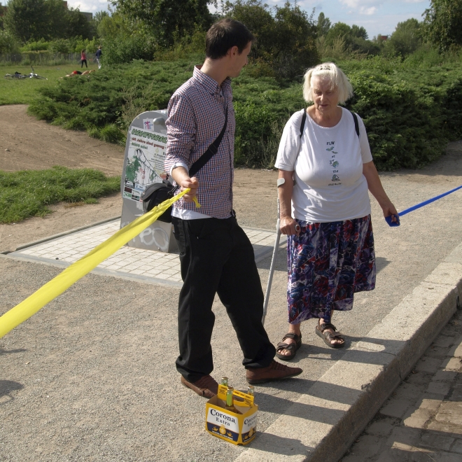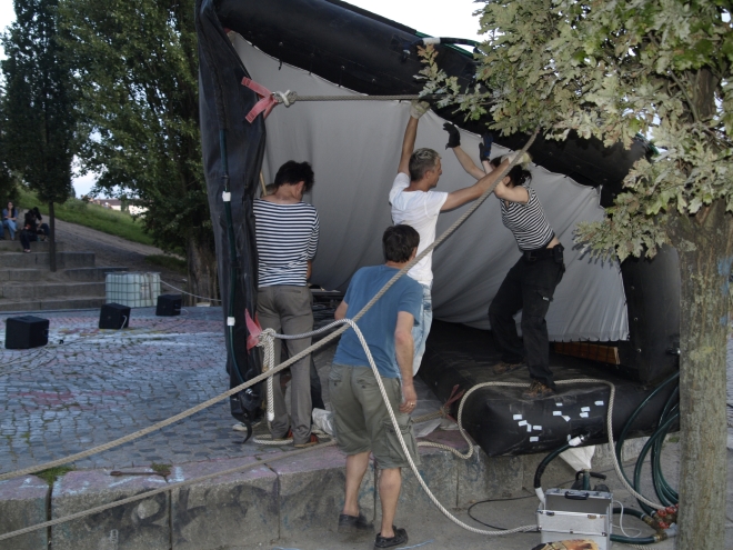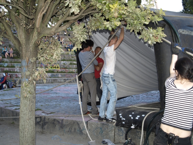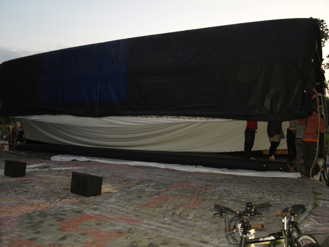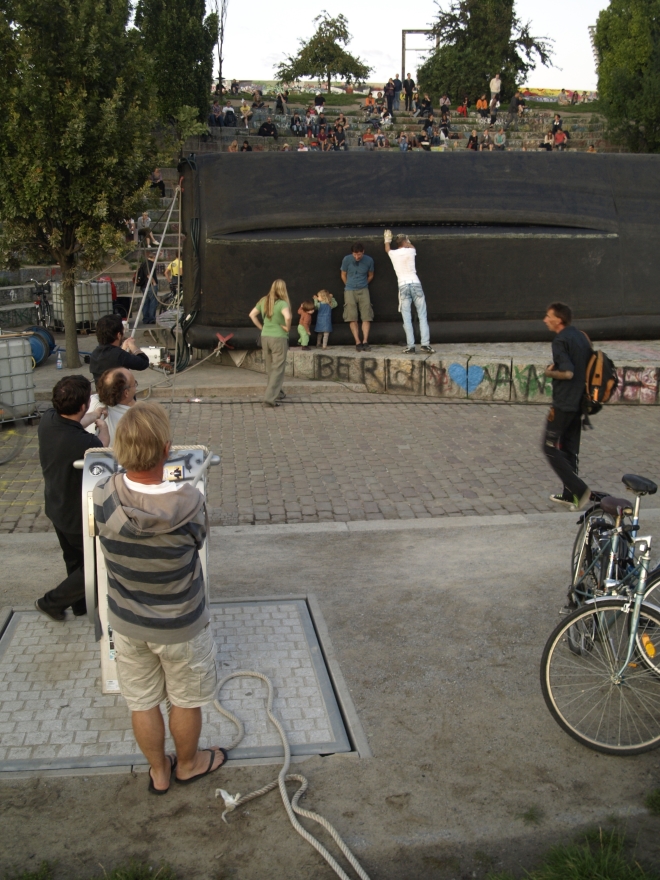 parkstiftung hochzuhalten. Dabei hätte nicht viel gefehlt, und die Vorführung wäre ausgefallen: Die angemietete aufblasbare Leinwand war schadhaft und konnte erst unter der tatktäftigen Mithilfe von zeitweise zwanzig Besuchern mühsam aufge-
