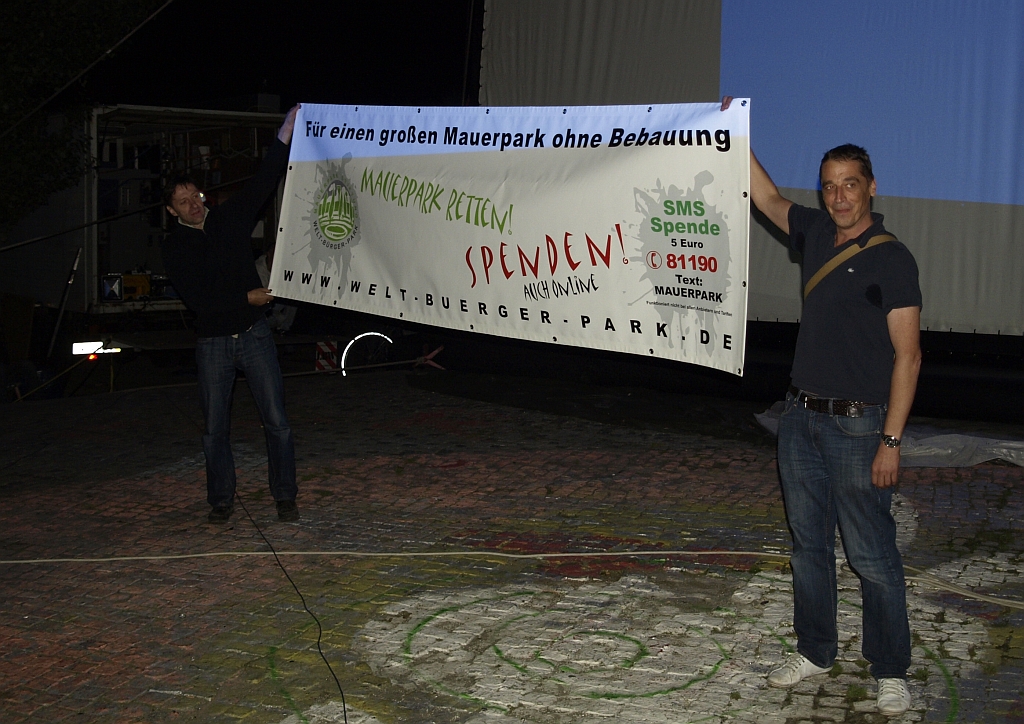 Am Ende stand ein strahlender Regisseur im Amphitheater, der den Beifall der rund 1.000 Zuschauer entgegennahm und gleich darauf mit „Weltbürgerpark“-Vorstand Heiner Funken das Transparent mit dem Spendenaufruf für die Weltbürger-