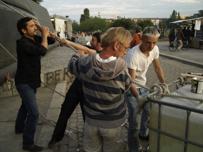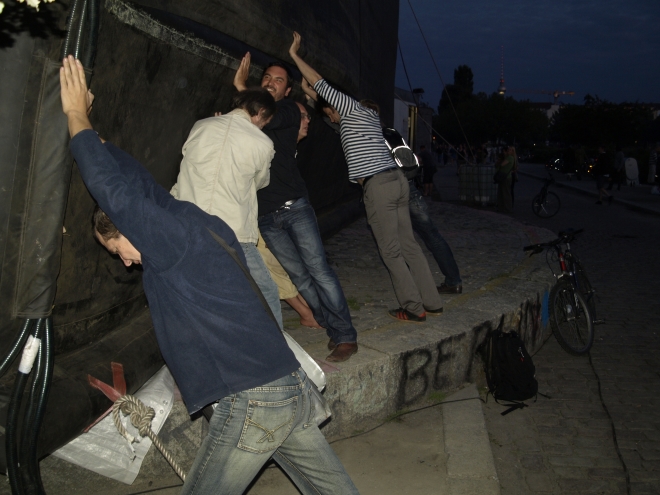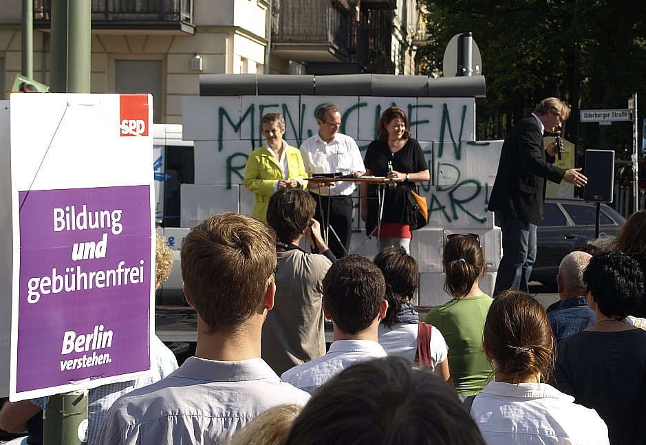 kehrsinsel, dessen einziger Schmuck ein SPD-Plakat darstellte. Die von der Prenzlberger Stimme gezählten gut einhundert Besucher (der Veranstalter sprach von „bis zu 200“)werden sich ihren Reim darauf gamacht haben…