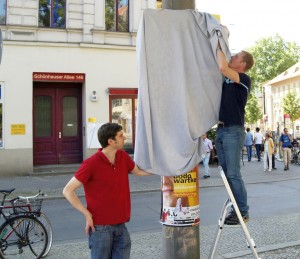 Heute Mittag gegen 12.15 Uhr auf der Fußgängerinsel an der Kreuzung Kastanien-/Ecke Schönhauser Allee: Zwei Herren stehen an einer Laterne, an der etwas befestigt ist, das den Blicken der vorübereilenden Passanten durch ein darüber gehängtes Stück Stoff noch entzogen ist.