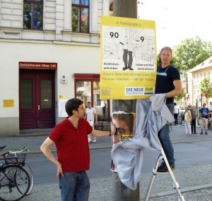 baren Allgemeinplätzen („Gute Arbeit, Berlin“, bzw. „Arbeit mit Zukunft“) „über „Arbeiterpartei“-Zumutungen bis hin zur grenzdebilen Wahl(!!!)-Aussage „Berlin verstehen“, ist hier nun wohl zum ersten Mal im kommunalen Wahlkampf dieses Jahres ein konkret den Bezirk, ja, den Kiez betreffendes Thema aufgegriffen worden. Eines, das von Anfang an kontrovers diskutiert wurde und auch jetzt noch die Gemüter erregt. Somit fand heute Mittag also eine echte Premiere statt. Mögen die andere Parteien folgen.