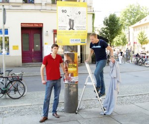 Dann erklimmt einer der beiden eine bereitstehende Leiter, greift zum Tuche, ein Ruck, und… zum Vorschein kommt – große Überraschung! – ein Plakat, ein – noch größere Überraschung! – ein Wahlplakat. Und zwar eines jener Partei, die sich derzeit ein Kopf-an-Kopf-Rennen mit der Piratenpartei liefert: Nicht um ein Bürgermeisteramt, nein, aber immerhin um den Einzug ins Abgeordnetenhaus.