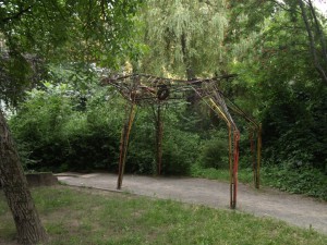 Der Eingang des neuen Spielparks wird sich in der Oderberger Straße befinden, ein auf einem Klinkersockel gesetzter Zaun schirmt die Anlage zur Straße hin ab. Ein asphaltierter Weg, der rechts und links mit einer Pflasterung begrenzt ist, führt den Besucher durch den „Schlauch“ der ehemaligen Zufahrt zum einstigen Garagengelände.