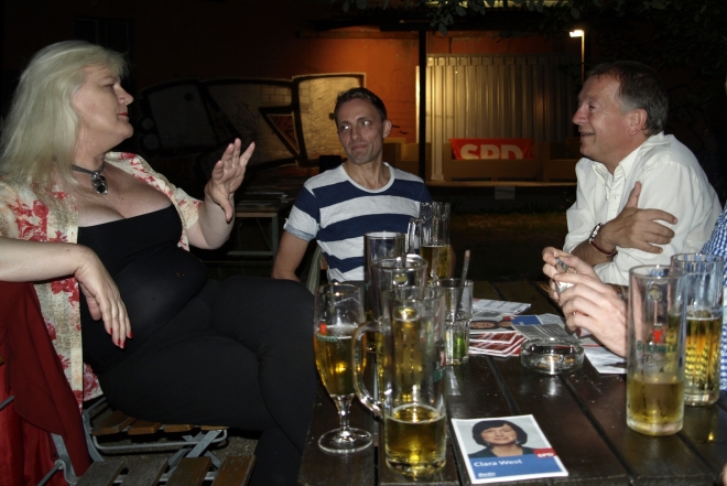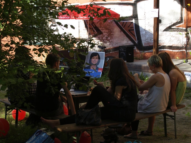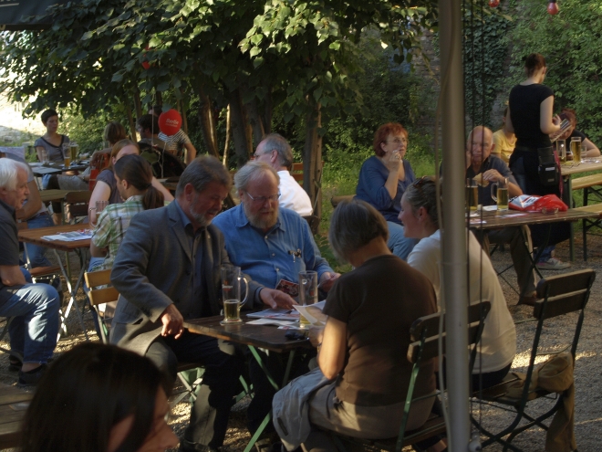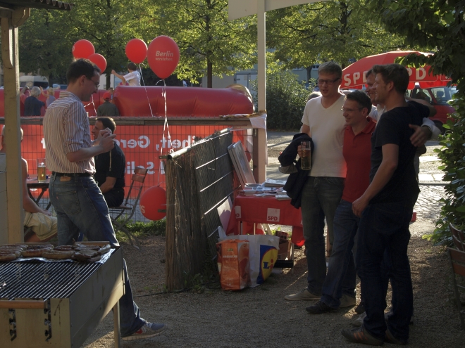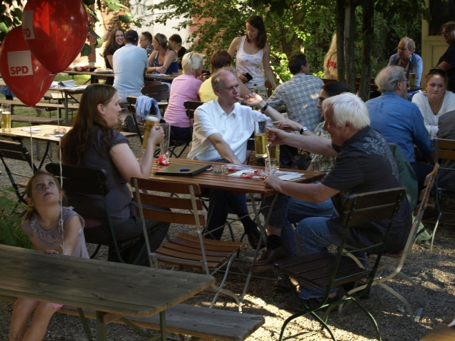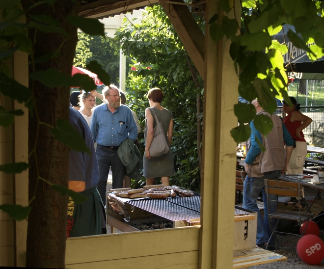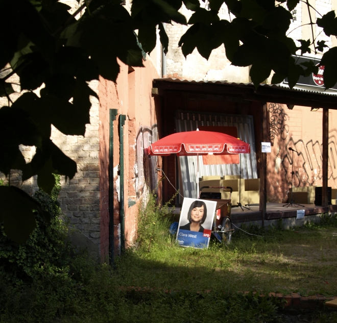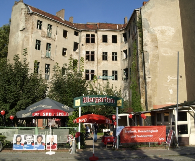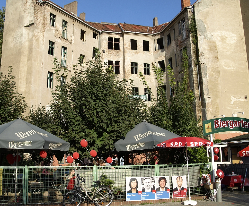 Ausgerechnet auf dem Grundstück der letzten Ruine im Viertel um die Naugarder Straße sommerfestete noch einmal fast alles, was in der Pankower Sozialdemokratie Rang und Namen hat. Pünktlich zum Anstich des Freibierfasses erschienen Genossen und Gäste aus der Umgebung sowie die SPD-Direktkandidaten des Bezirks im Garten der Gastwirtschaft „Kolonie“. Mit abnehmendem Füllstand der Tonne fühlte man sich mehr und mehr um ein Jahrhundert zurückversetzt: So ungefähr mussten die legendären Gartenfeste der Sozialdemokraten vor dem ersten Weltkrieg gewesen sein. Als dann noch Erich Mühsam erschien, war die Verwirrung perfekt: Was macht der bei der SPD? Aber dann war es doch bloß Wolfgang Thierse. Schade eigentlich…
