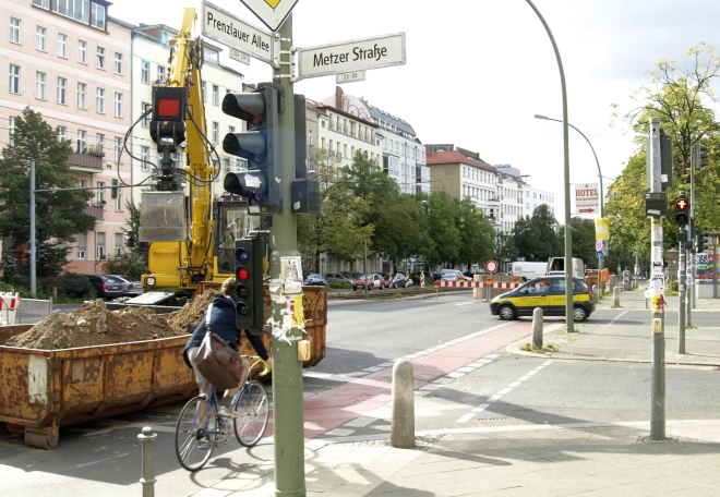 Die Ein- und Ausfahrt von der Metzer Straße von die Prenzlauer Allee (stadtauswärts) ist derzeit noch möglich. Straßenbahn und Radwege sind von der Sperrung nicht betroffen.