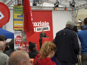 Dabei hatte das, worüber sie sprachen, zumindest direkt kaum etwas mit Pankow oder auch nur der Berliner Landespolitik zu tun: Oskar Lafontaine sprach wie so oft schon über Banken und Weltwirtschaftskrise, und Gregor Gysi wiederholte gar seine Bundestagsrede aus der Haushaltsdebatte vom 7. September. Das machte aber nichts. Wer den beiden zuhörte, den konnte Wehmut überkommen: Weil man erlebte, wie eine politische Rede sein könnte – und dies dann mit all dem verglich, was man in den vergangenen Tagen und Wochen so über sich ergehen lassen durfte…