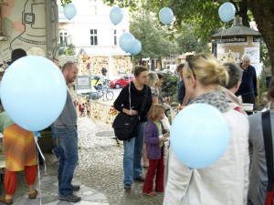 Nachdem über Wochen auf allen Festplätzen die Luftballons in den Parteifarben Rot, Grün, Gelb und Orange das Bild bestimmten, dominierte am Helmholtzplatz nun Himmelblau. Dort gabs ein kleines Fest, organisiert vom Förderverein Helmholtzplatz, der Kita Helmistrolche, dem Tauschring Helmholtzplatz und dem Polizeiabschnitt 15. Der Förderverein bot Kaffee und Kuchen an und der Tauschring Dinge zum Tauschen. Bei den Helmistrolchen konnten Kinder malen – oder sich bemalen lassen. Die Polizei war mit einem überdimensionierten Zelt vertreten sowie einem Stand, an dem man sich seinen ganz persönlichen Code in den Fahrradrahmen fräsen lassen konnte – wegen der Wiedererkennung nach nach einem Diebstahl. Desweiteren hatten die Beamten einen Kollegen abgestellt, der in einem Plüschteddyfell und einer darüber gezogenen Uniform die Kinder erheitern sollte. Dialog am Rande: „Das ist ein Polizist, der hat sich als Bär verkleidet.“ – „Ach was! Das ist ein Bär, der sich als Polizist verkleidet hat.“
