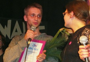 Es ist ja nett, dass die Prenzelberger Stimme den Film „Unsere Torfstraße“ als Publikumsliebling und damit erst platzierten deklariert. Doch eigentlich wurde der Film „Plötzensee“ erster. Jedensfalls wurde es von den Veranstaltern gestern so bekannt gegeben. Das Foto ist auch falsch untertitelt. Es müsste heissen Sven Mücke: Platz 2 für „Unsere Torfstraße“. Oder ihr tauscht das Bild einfach aus. Wie konnte es zu dieser Verwechslung kommen? Welche Realität ist jetzt die richtige? 😉
