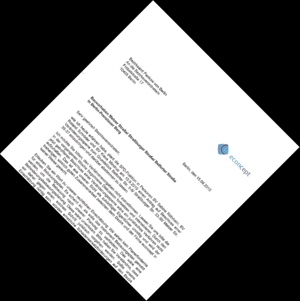 Die Abgeordneten der Bezirksverordnetenversammlung von Pankow hatten kurz vor ihrer Sitzung am 15. September Post bekommen. Absender war die Firma econcept von KolleBelle-Investor Rainer Bahr. In dem