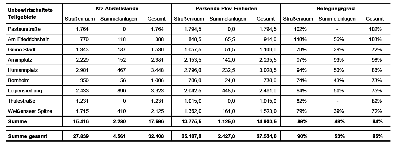 Für die Teilgebiete “Bornholm”, Thulestraße, Legiensiedlung, Weißenseer Spitze und Michelangelostraße, die ebenfalls an die neu ins Visier genommenen Parkzonen-Kandidaten grenzen, sieht das Gutachten derzeit noch keine Bewirtschaftungs-Notwendigkeiten – empfiehlt aber eine Beobachtung der weiteren Entwicklung.