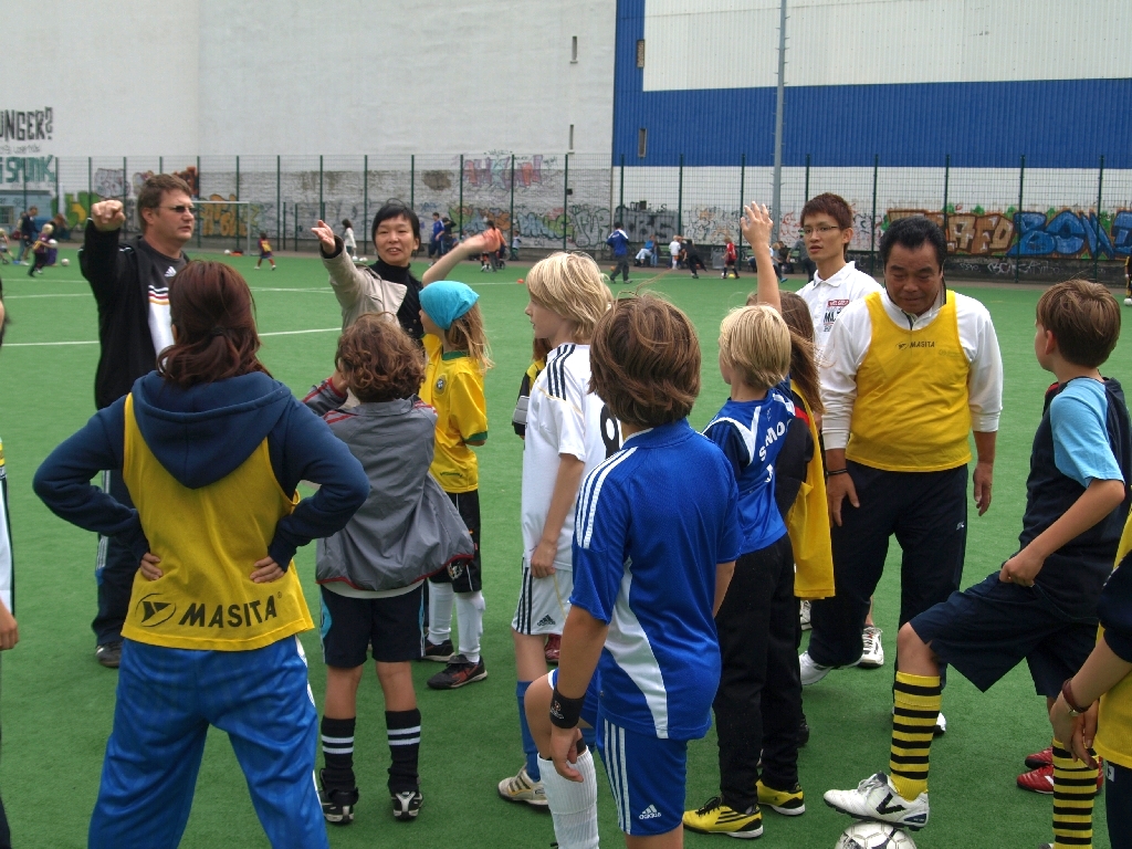 „Wir haben gestern einem Vortrag über die Arbeit mit Kinder und Jugendlichen in Deutschland gehört“, sagte Delegationsleiter Kenji Saruwatari, „und jetzt wollen wir und das einmal konkret anschauen.“ Es blieb nicht beim Anschauen. Die japanische Gäste streiften sich kurzerhand Trikots über und trainierten mit. Und so hallten neben den deutschen Trainingsanweisungen auch gleich immer die japanische Übersetzung von den Häuserwänden zurück.