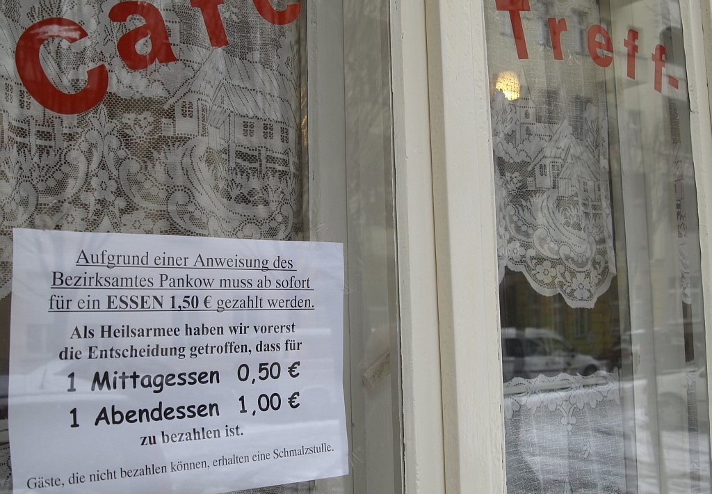 Sozialsergeant Siegfried Fischer ist seit über zwanzig Jahren in Prenzlauer Berg – aber so etwas hat er noch nicht erlebt: Es geht auf das Monatsende zu, doch das „Café Treffpunkt“, die Sozialstation der Heilsarmee in der Kuglerstraße ist selbst zur Mittagszeit eher spärlich besucht. Der Grund ist auf einen Zettel zu lesen, der schon draußen am Schaufenster so manchen potentiellen Gast wieder kehrt machen lässt: „Auf Grund einer Anweisung des Bezirksamtes Pankow muss sofort für ein Essen 1,50 Euro gezahlt werden. Als Heilsarmee haben wir vorerst die Entscheidung getroffen, dass für 1 Mittagessen 0.50 Euro, 1 Abendesse 1,00 Euro zu bezahlen ist.“