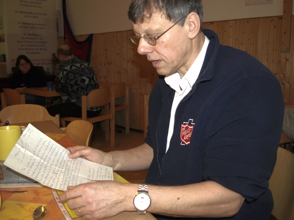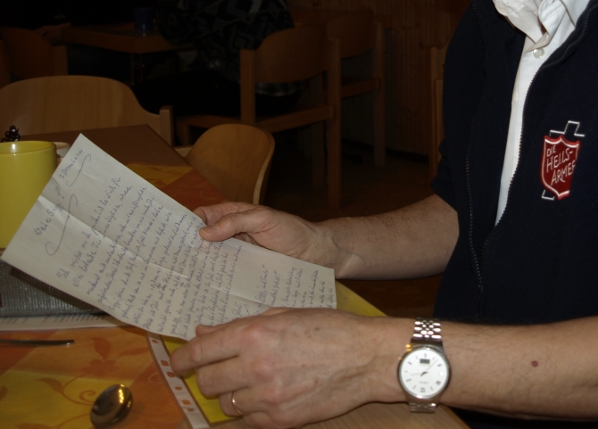 „Hätte ich dich und die Heilsarmee nicht kennengelernt,“ ist da zu lesen, „wäre ich vielleicht gar nicht mehr auf der Welt. Denn ich hätte es nicht allein geschafft, da aus allem raus zu kommmen. Durch deine Gespräche und Gebete bin ich stark geworden, von dem Alkohol und von der Straße zu kommen…“