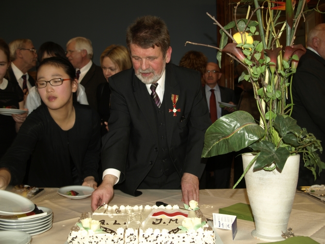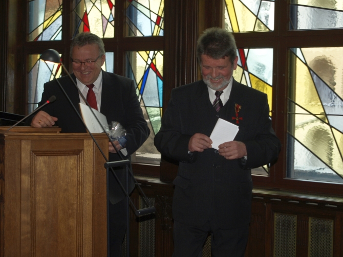 Weil jedoch ein Bildbericht über eine Ordensverleihung ohne die Verleihung des Ordens zu zeigen nun in der Tat etwas unvollständig wirkt, sei hier ausdrücklich dem Kollegen Bernd Wähner gedankt, der den historischen Moment im Bild festhielt und mir mit der Überlassung zweier Fotos half, den unübersehbaren Mangel dieses Beitrages zu beheben.