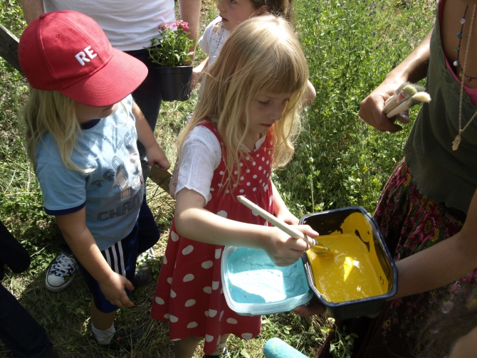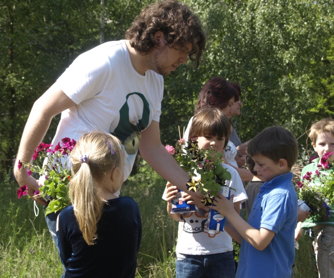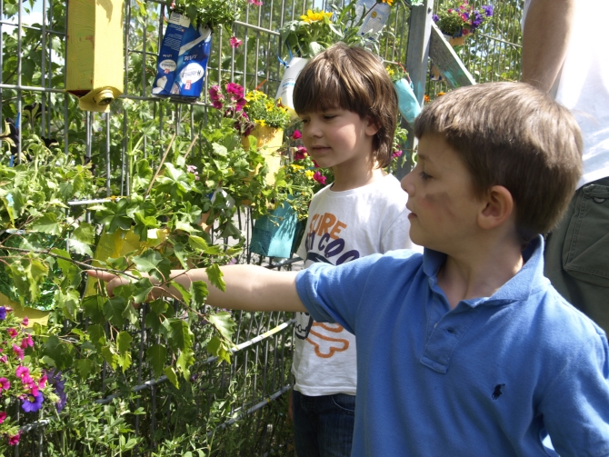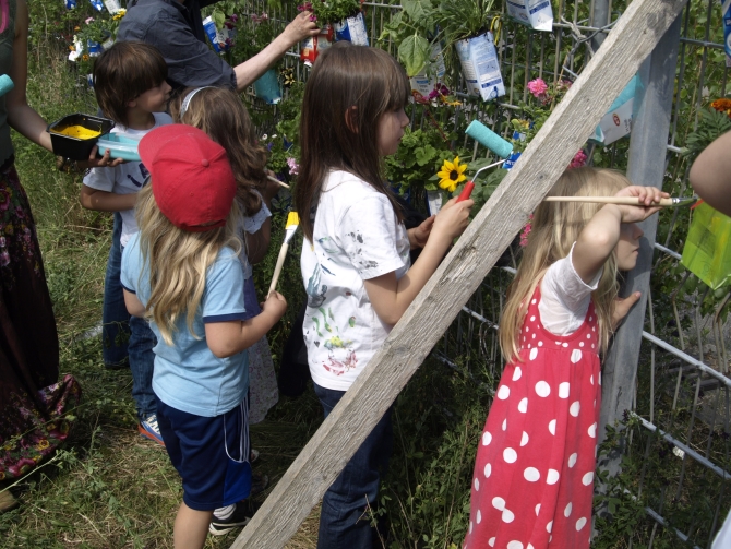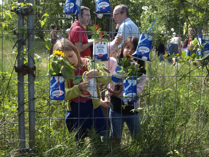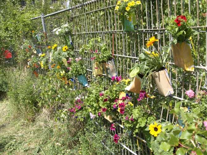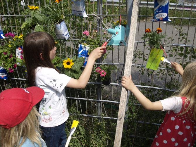 Nicht alle Pflanzen wurden in den Boden gebracht – eine ganze Reihe von Blumen wurde in mit Erdreich gefüllte Milchkartons gesetzt, danach an den das Grundstück begrenzenden Zaun gehängt und zum Schluss auch noch bunt bemalt. Also: Die Kartons, nicht die Blumen.