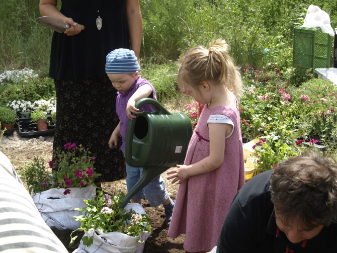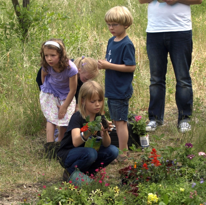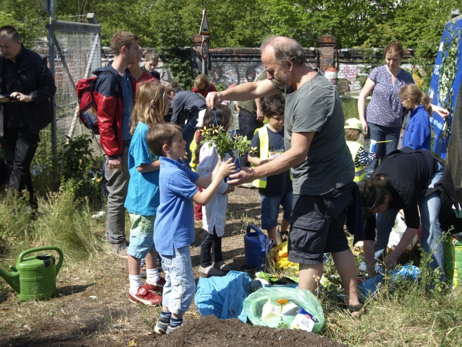 Kinder der Freien Schule am Mauerpark sowie aus Prenzlauer Berger und dem Weddinger Kindertagesstätten trafen sich gestern (Montag) im westlichen (Weddinger) Teil des Mauerparks zu einer Blumenpflanz-Aktion. Dazu eingeladen hatte die „Mauerpark Stiftung Welt-Bürger-Park“.