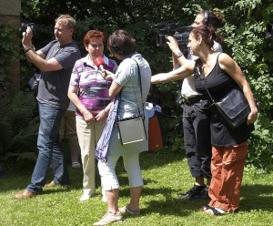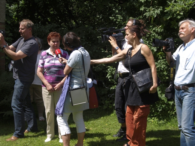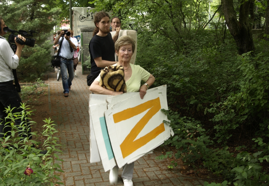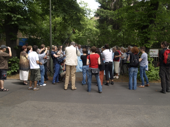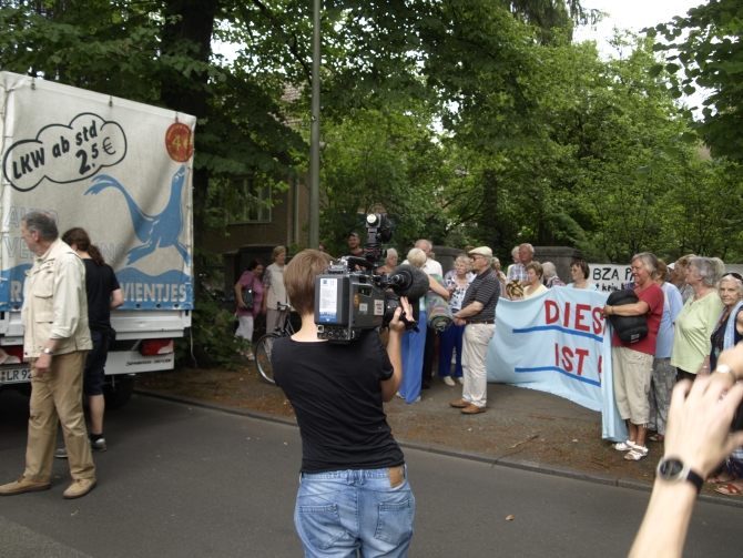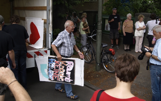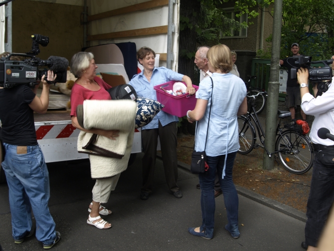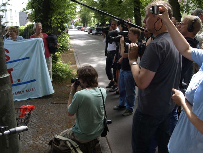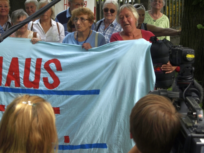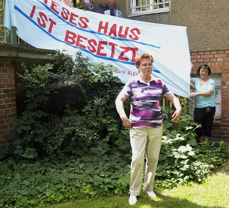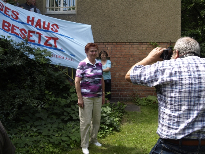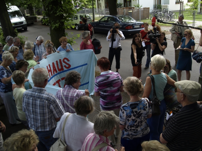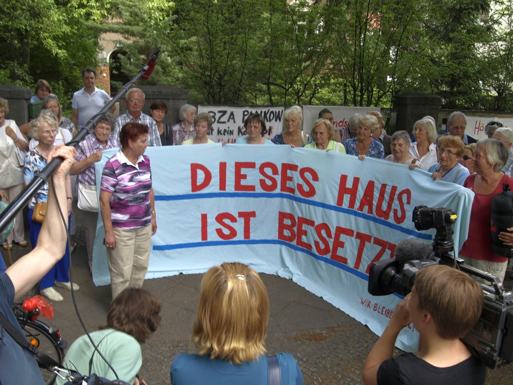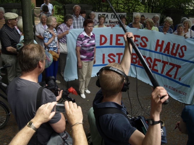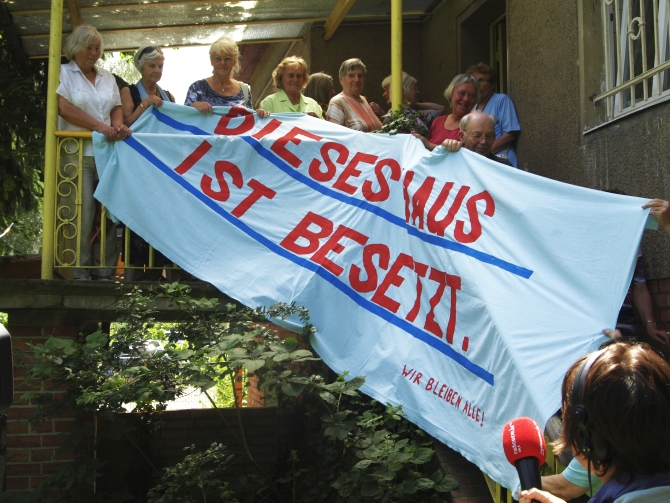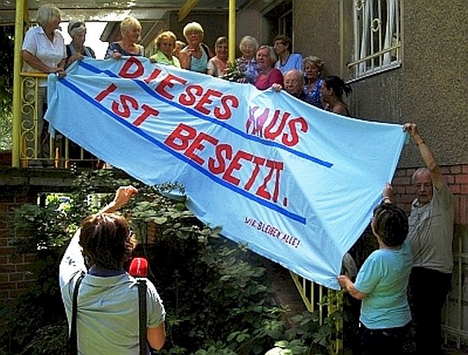 Freitag Mittag 13 Uhr: Auf der dem Garten des Hauses zugewandten Terrasse versammelt sich ein Teil der rund fünfzig anwesenden Sechzig- bis Neunzigjährigen, um ein Transparent zu entfalten. „Dieses Haus ist besetzt“ steht da in großen Lettern, unten stehen Fotografen und Journalisten von Berliner Tageszeitungen. Der rbb hat ein Kamerateam geschickt, der Hörfunk ist auch da.