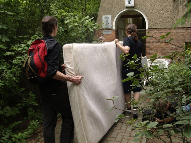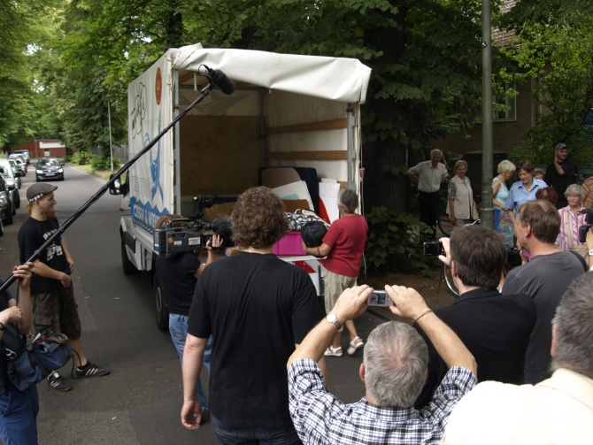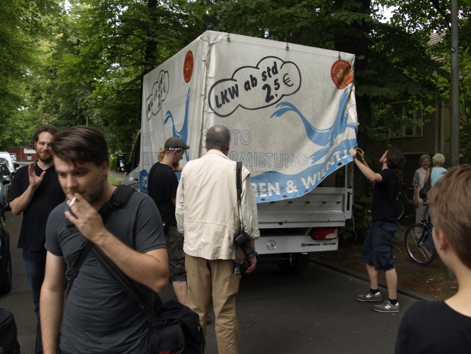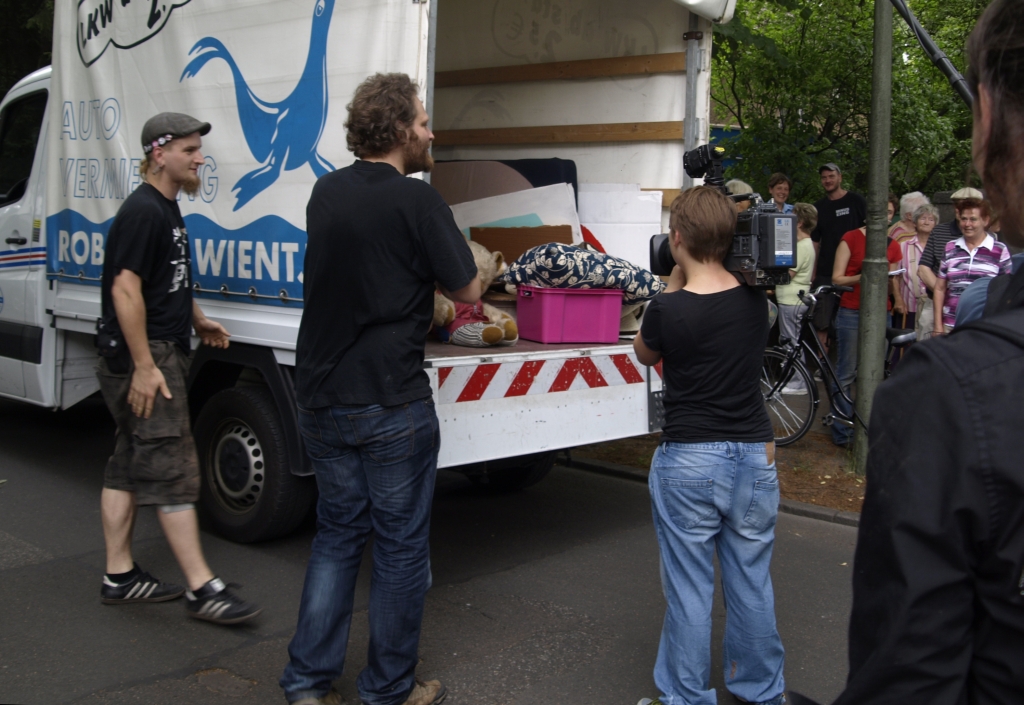 Plötzlich fährt ein Kleintransporter vor. Ihm entsteigen ein paar junge Männer, öffnen die Heckklappe und Vorschein kommt all jene Dinge, die man für eine Hausbesetzung so braucht: Matratzen, Decken, Transparente…