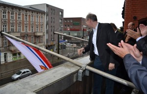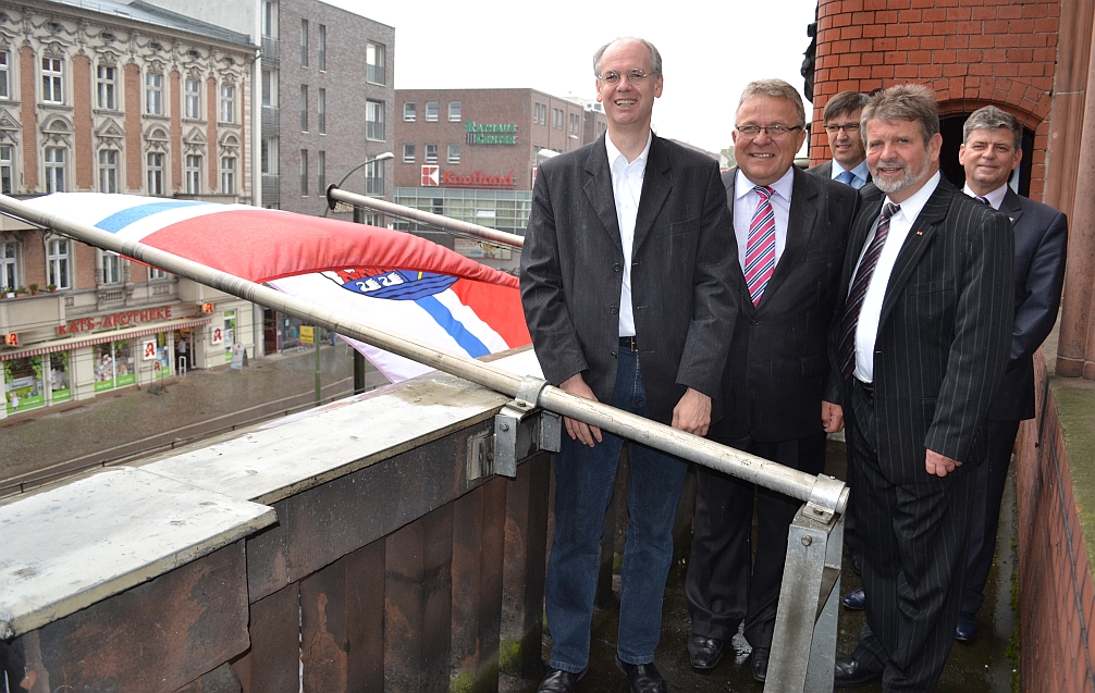 Also machten sich Kołobrzegs Stadtoberhaupt Janusz Gromek und sein Pankower Kollege Matthias Köhne auf dem Balkon des Rathauses gemeinsam ans Werk, das Zeichen zu setzen. Mit dabei war – wie immer, wenn es um Kołobrzeg/Kolberg geht – Alex Lubawinski, der Vorsitzende des Vereins Freunde Kolbergs e.V.