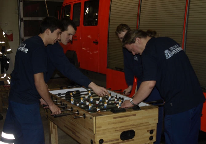 Ruhig blieb es – ganz entgegen den Erwartungen – bis kurz vor Mitternacht bei der Freiwilligen Feuerwehr in der Schieritzstraße. Gegen die aufkommende Langeweile half der Kicker. gegen 23.30 Uhr dann ein Einsatz in der Erich-Weinert-Straße: Doch da war kein Feuer zu löschen, sondern