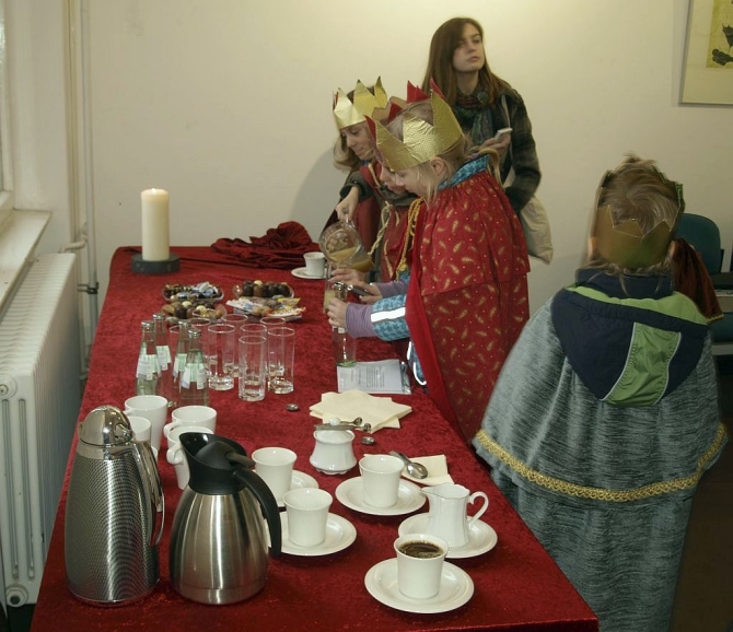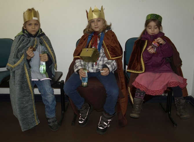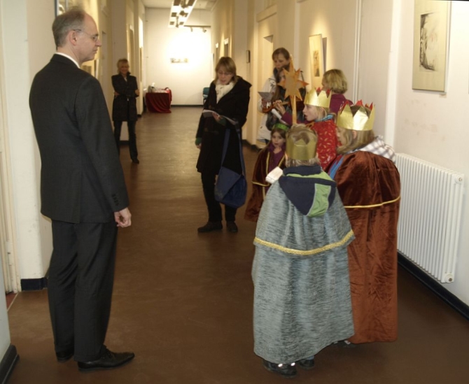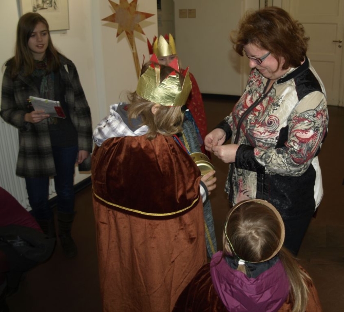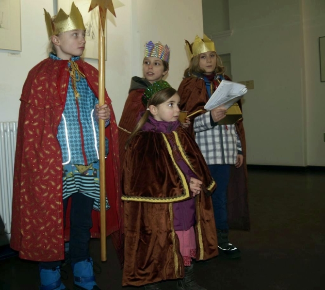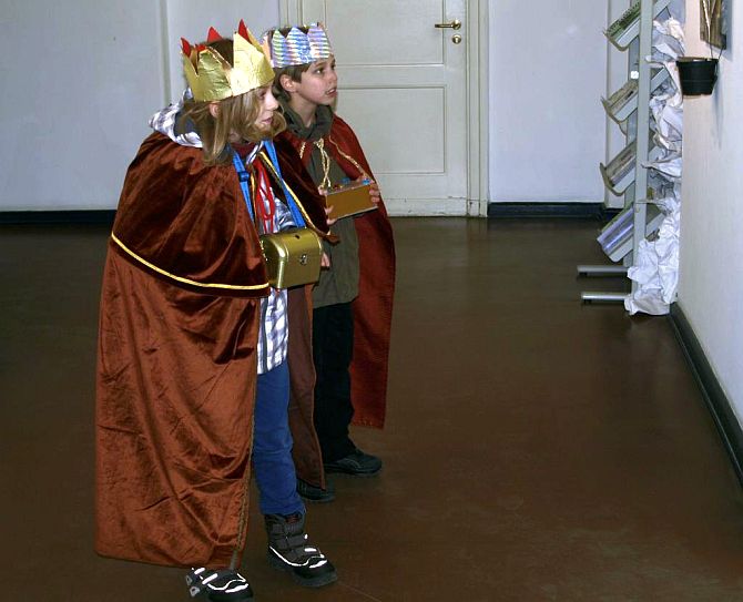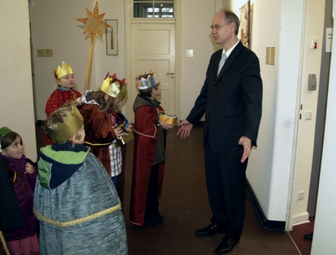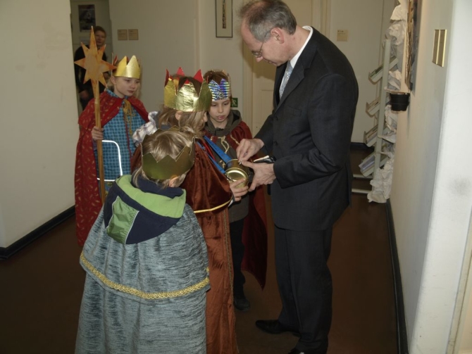 Doch Bezirksbürgermeister Matthias Köhne war noch da (wo sollte er auch hin?) und so konnten die als Caspar, Melchior und Balthasar verkleideten Sternsinger der katholischen Kirchengemeinde St. Georg nicht nur ihr Lied vortragen, sondern den Bürgermeister auch um eine Spende bitten. Gesammelt wird in diesem Jahr für die Unterstützung der Gesundheitsbetreuung von Kindern in Tansania.
