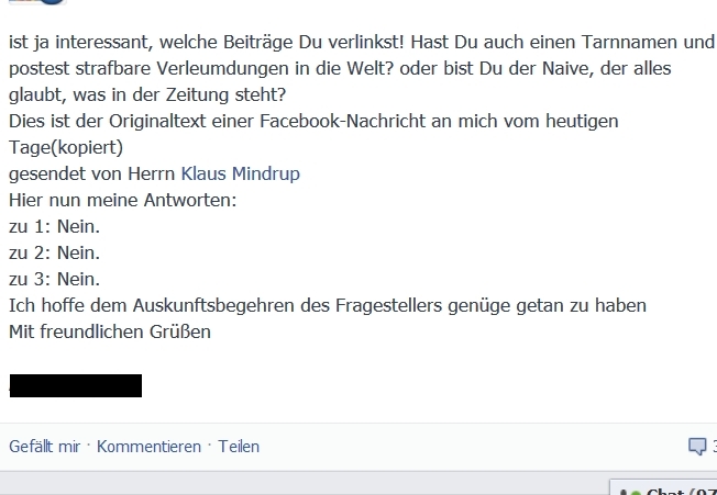 So konnte man auf einer Facebook-Seite den Inhalt einer Mindrup-Mail an einen Genossen lesen (siehe Screenshot links), der die Anmotzerei öffentlich gemacht hatte: „Ist ja interessant, welche Beiträge du verlinkst! Hast du auch einen Tarnnamen und postest strafbare Verleumdungen in die Welt?“