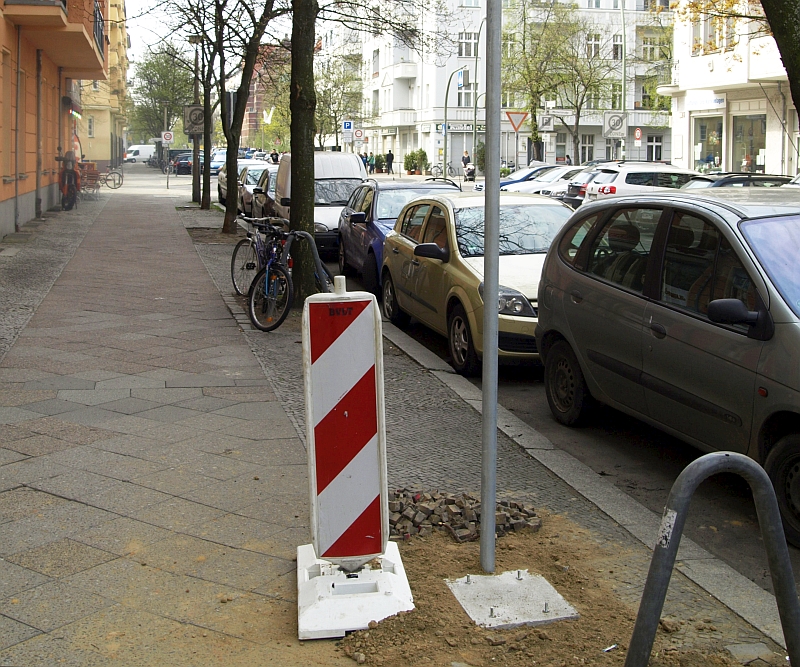 In größerer Anzahl aufgestellt (um nicht zu sagen: ausgesetzt) wurden sie in letzter Zeit vom Bezirksamt Pankow überall dort, wo künftig Parkscheinautomaten ihre Heimstatt finden sollen.