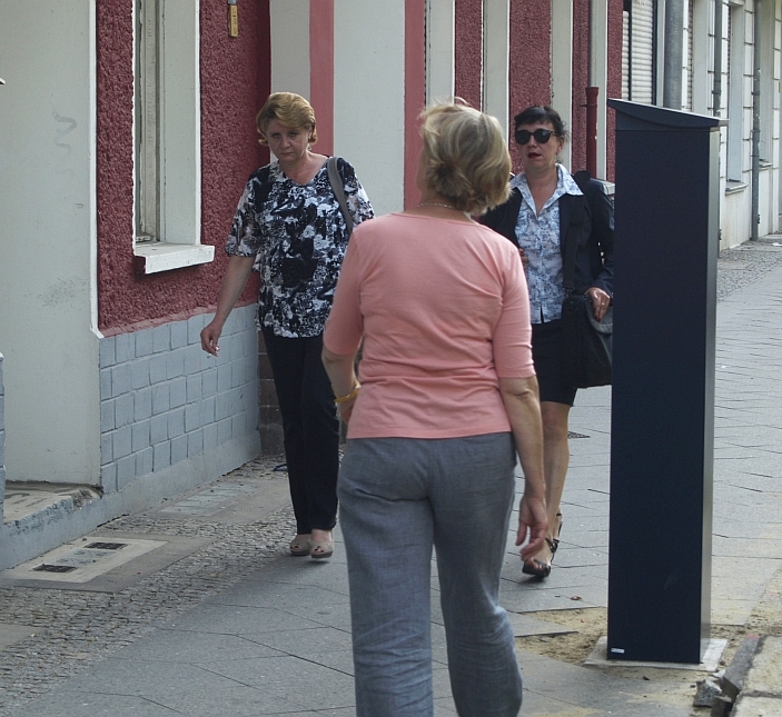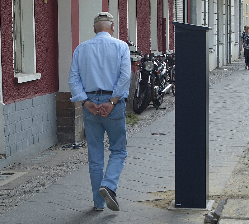 streifen verrichten, stellt sich die Säule vor dem Haus Wichertstraße 52 dreisterweise den Fußgängern in den nicht gerade mit üppiger Breite gesegneten Weg. So, als wollte sie den Nutzern des Bürgersteigs eine Mautgebühr abverlangen.