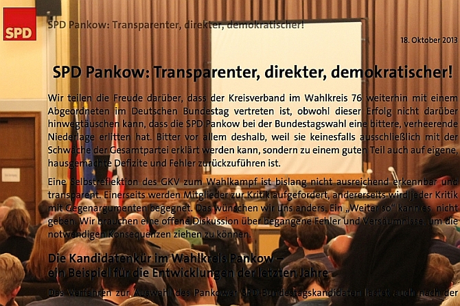„Das Verfahren zur Auswahl des Pankower SPD-Bundestagskandidaten lastet auch nach der Wahl als schwere Hypothek auf der Partei. Hier zeigt sich beispielhaft die Fehlentwicklung in unserem Kreis der letzten Jahre“, heißt es in einem Ende vergangener Woche öffentlich gemachten Positionspapier einer Gruppe SPD-Genossen des Bezirks siehe Download unten).