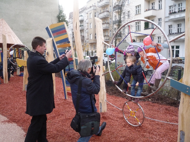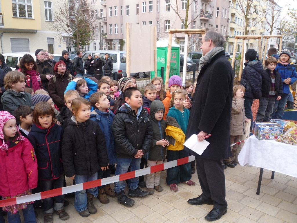 Also bitte: Wenn nun etwas gar nicht geht, dann Kinder im Angesicht von Spielmöglichkeiten und Naschereien warten zu lassen. Aber Bezirksbürgermeister Matthias Köhne machte am Mittwoch in der Hans-Otto-Straße genau das. Denn die offizielle Eröffnung des neuerbauten Spielplatzes mit dem schönen Namen „Ein Traum“ war für 15 Uhr angesetzt – und keine Minute früher. Doch die Kleinen aus den umliegenden Kitas und Schulen zeigten eine erstaunliche Geduld. Selbst dann noch, als es endlich Drei schlug – und der Platz immer noch nicht freigegeben wurde. Irgendjemand muss den Kids wohl