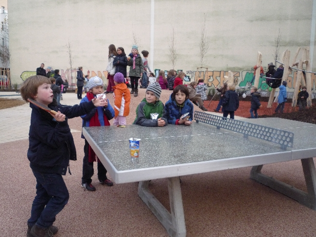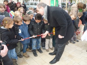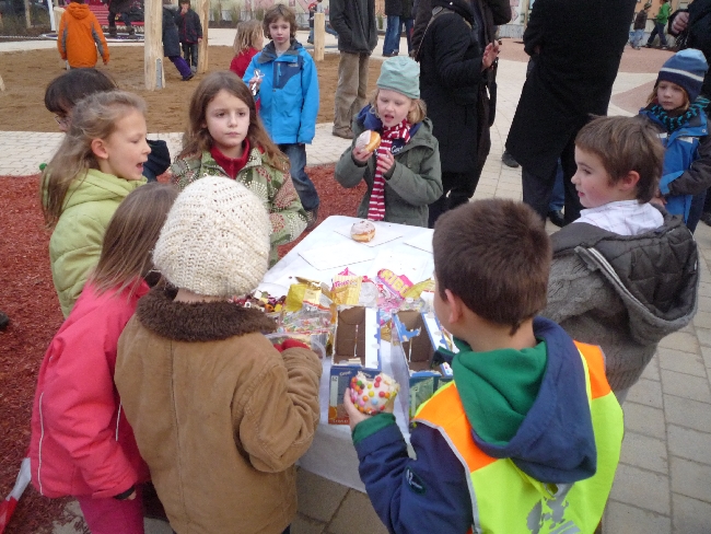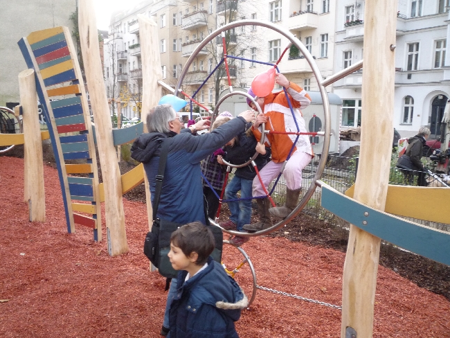 Aber dann war es so weit (sooo lang war die Rede ja nun auch wieder nicht): Der Bürgermeister nahm die Schere und – schnippschnapp – endlich war der Weg frei. Und während die einen sofort zu den ungewöhnlich aussehenden Klettergeräten und Schaukeln rannten, stärkten sich andere erstmal am Kalten Buffet. Das bestand zum einen aus Pfannkuchen (von Auswärtigen und Zugezogen seltsamerweise „Berliner“ genannt) sowie allerlei Gummigetier. Und weil das ja ein offizieller Termin war, fehlten ein Pressefotograf nicht, der den Kleinen