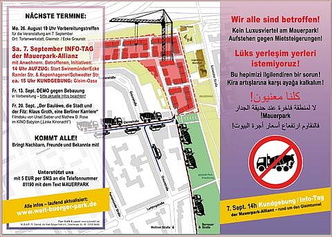 Für den 7. September ist eine Demonstration geplant. Unter dem Motto “Gegen ‘SchwarzRotGroth’ soll in zwei Aufzügen – je einer auf Weddinger und auf Pankower Seite – auf die lange “Spur des Bauinvestors Klaus Groth” aufmerksam gemacht werden, die “von dubiosen Geschäften und Spendenaffären geprägt“ sei.