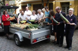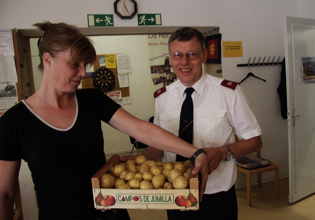 tetem Obst und Gemüse in der Kuglerstraße vorgefahren, um die Küche des „Cafè Treffpunkt“ – dem Sozialstützpunkt der Prenzlauer Berger Heilsarmee – an der diesjährigen Ernte teihaben zu lassen. Gäste des Cafés packten beim Ausladen mit an – und schon glich der Gastraum einer kleinen Früchteausstellung.